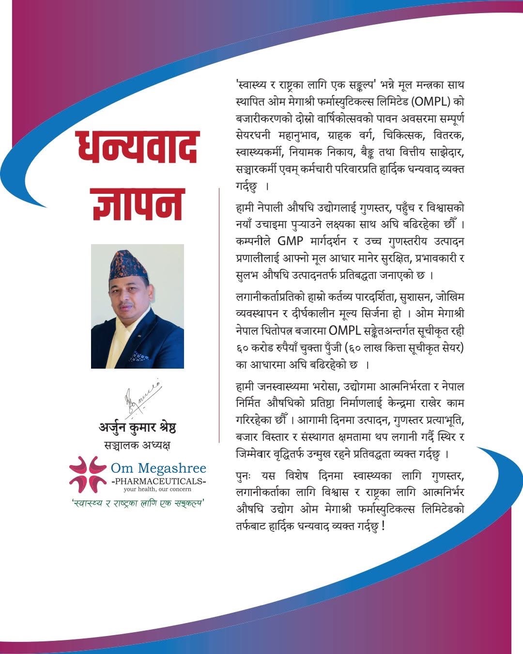 “स्वास्थ्य र राष्ट्रका लागि एक सङ्कल्प” भन्ने मूल मन्त्रका साथ स्थापित ओम मेगाश्री फार्मास्युटिकल्स लिमिटेड को बजारीकरणको दोस्रो वार्षिकोत्सवको अवसरमा कम्पनीका सञ्चालक अध्यक्ष अर्जुन कुमार श्रेष्ठले सम्पूर्ण शेयरधनी महानुभाव, ग्राहक वर्ग, चिकित्सक, वितरक, स्वास्थ्यकर्मी, नियामक निकाय, बैंक तथा वित्तीय साझेदार, सञ्चारकर्मी एवं कर्मचारी परिवारप्रति हार्दिक धन्यवाद व्यक्त गरेका छन ।