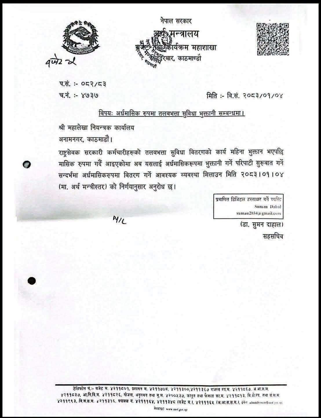 नयाँ व्यवस्थाअनुसार अब सरकारी कर्मचारीहरूले महिनामा एकपटक होइन, दुईपटक तलबभत्ता प्राप्त गर्नेछन्, जसले उनीहरूको आर्थिक व्यवस्थापनमा समेत सहजता ल्याउने अपेक्षा गरिएको छ।